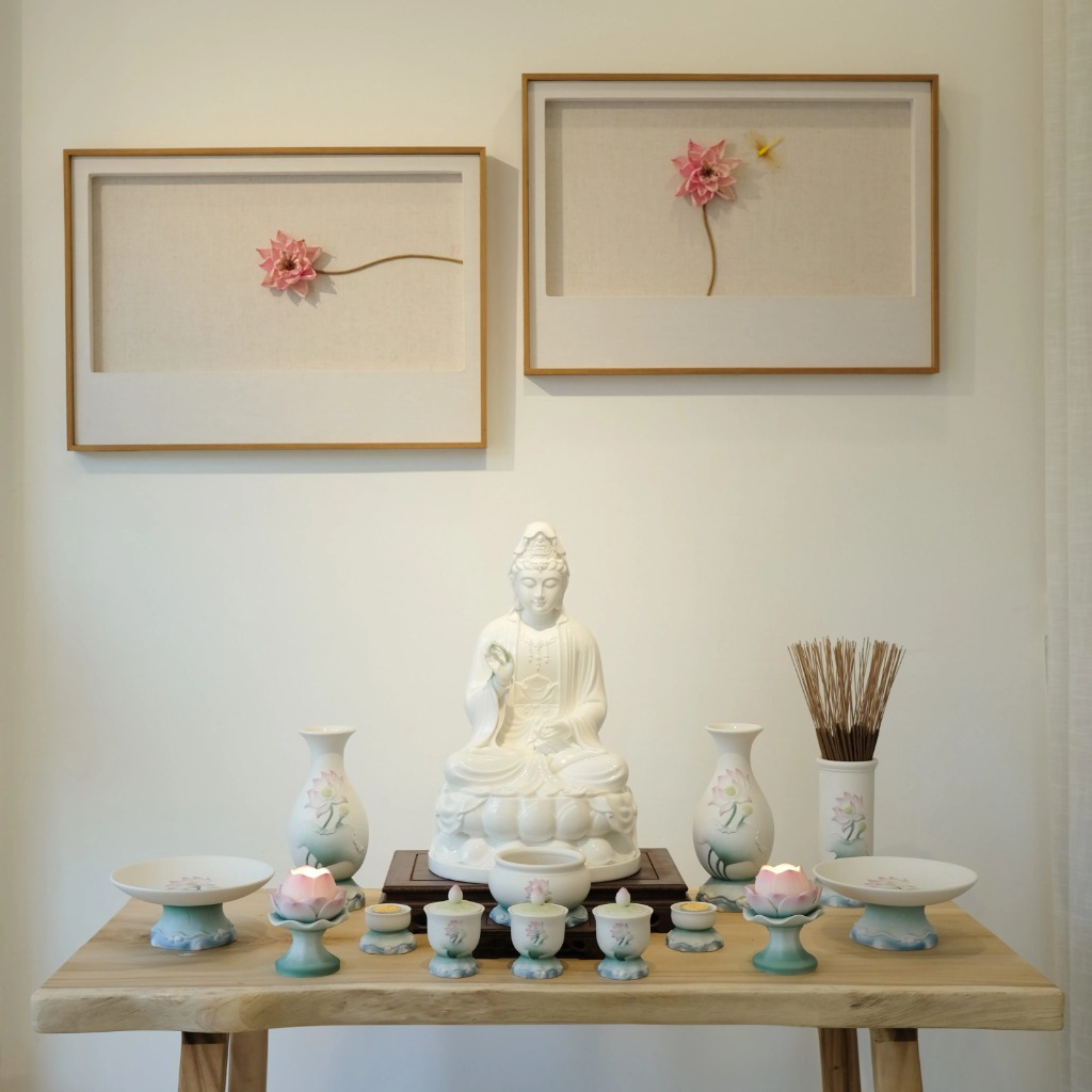 Bộ đồ thờ sứ gồm lư hương, ly nước (chén nước), đế nến, đĩa bồng (đĩa trái cây), bình hoa. Bộ thờ được làm từ gốm, với hoa sen vẽ màu thủ công tỉ mỉ. mỗi chi tiết đều được chăm chút để tạo nên sự chỉn chu và trang nghiêm cho không gian thờ tự gia đình.