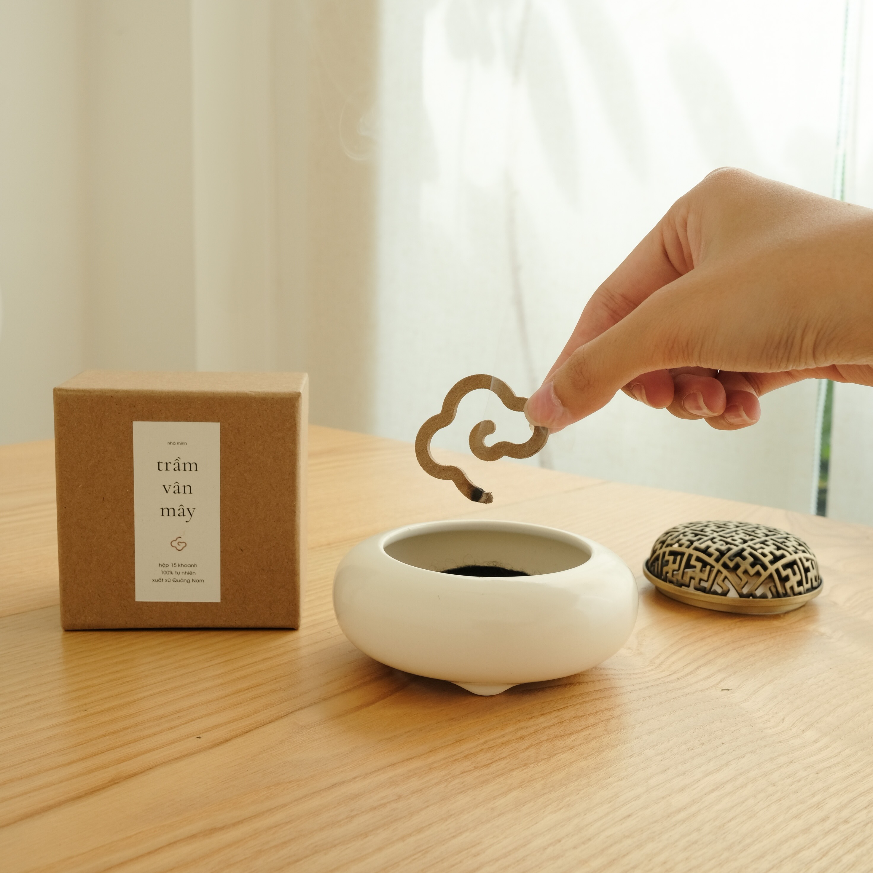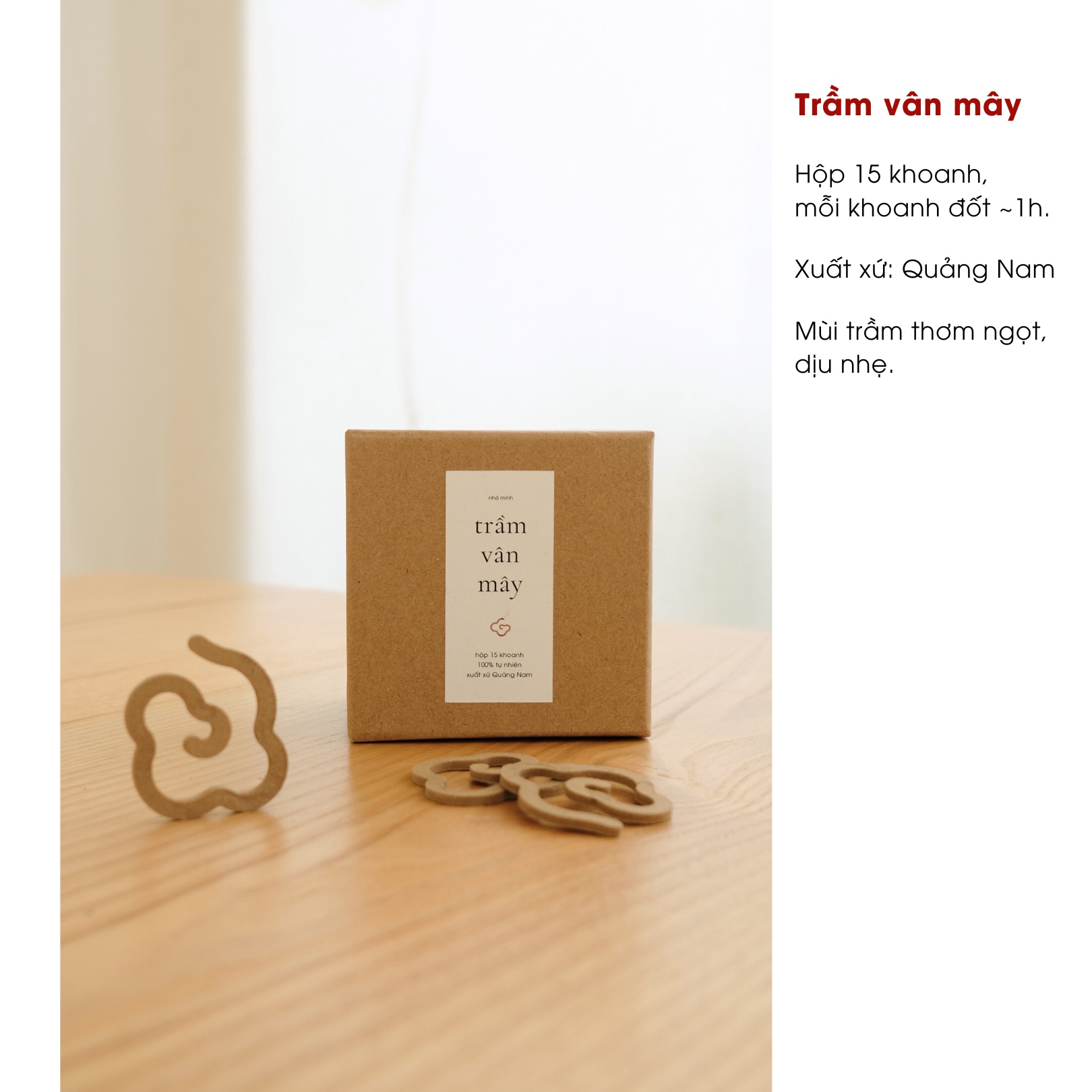 Hộp gồm 15 khoanh, mỗi khoanh thắp khoảng 1 tiếng, vừa đủ cho một buổi thư giãn, thiền trà hay đọc sách.