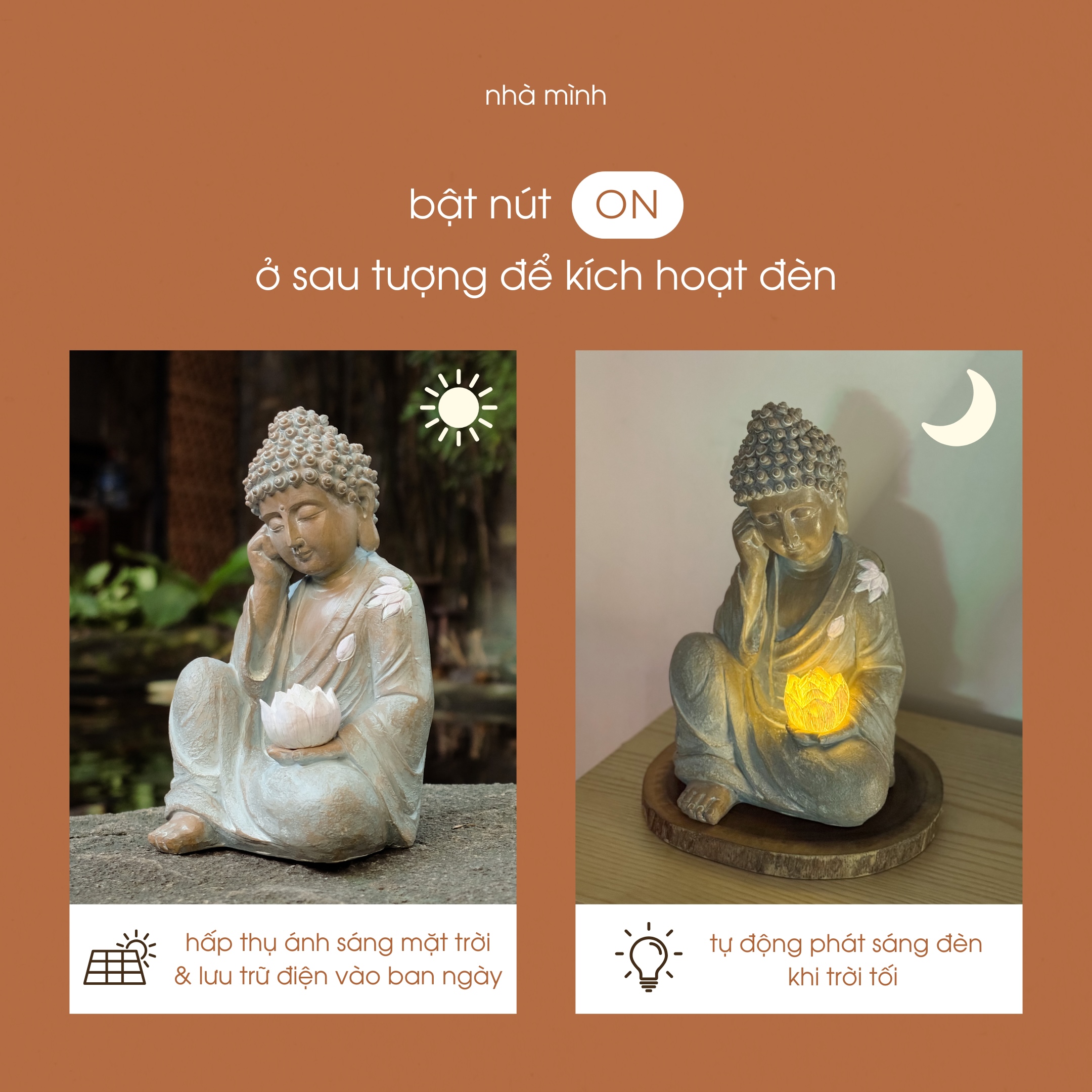 Tượng phù hợp đặt ở ban công, sân vườn hay những không gian đón nắng. Khi về đêm, đoá sen trên tay Ngài sẽ toả sáng nhờ năng lượng mặt trời, tạo không gian tĩnh tại, nâng niu sự bình yên cho ngôi nhà.