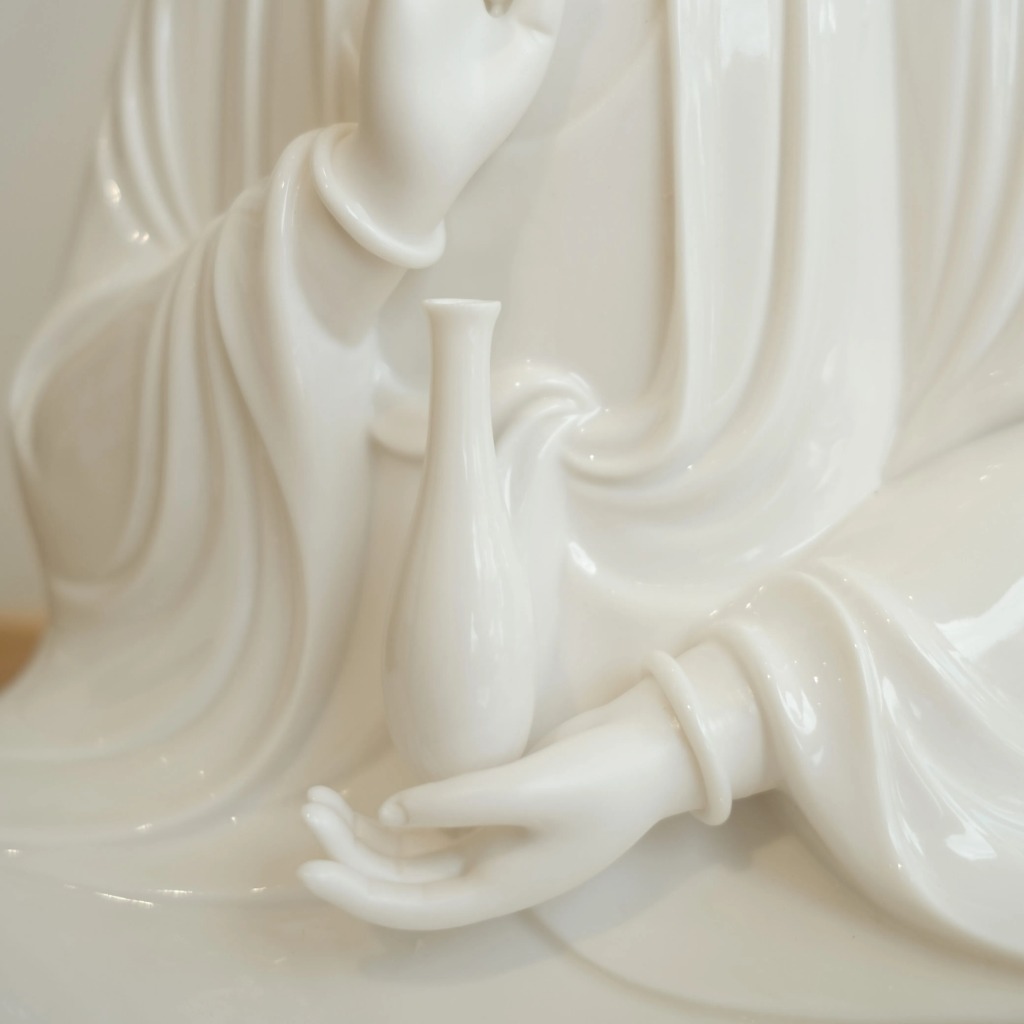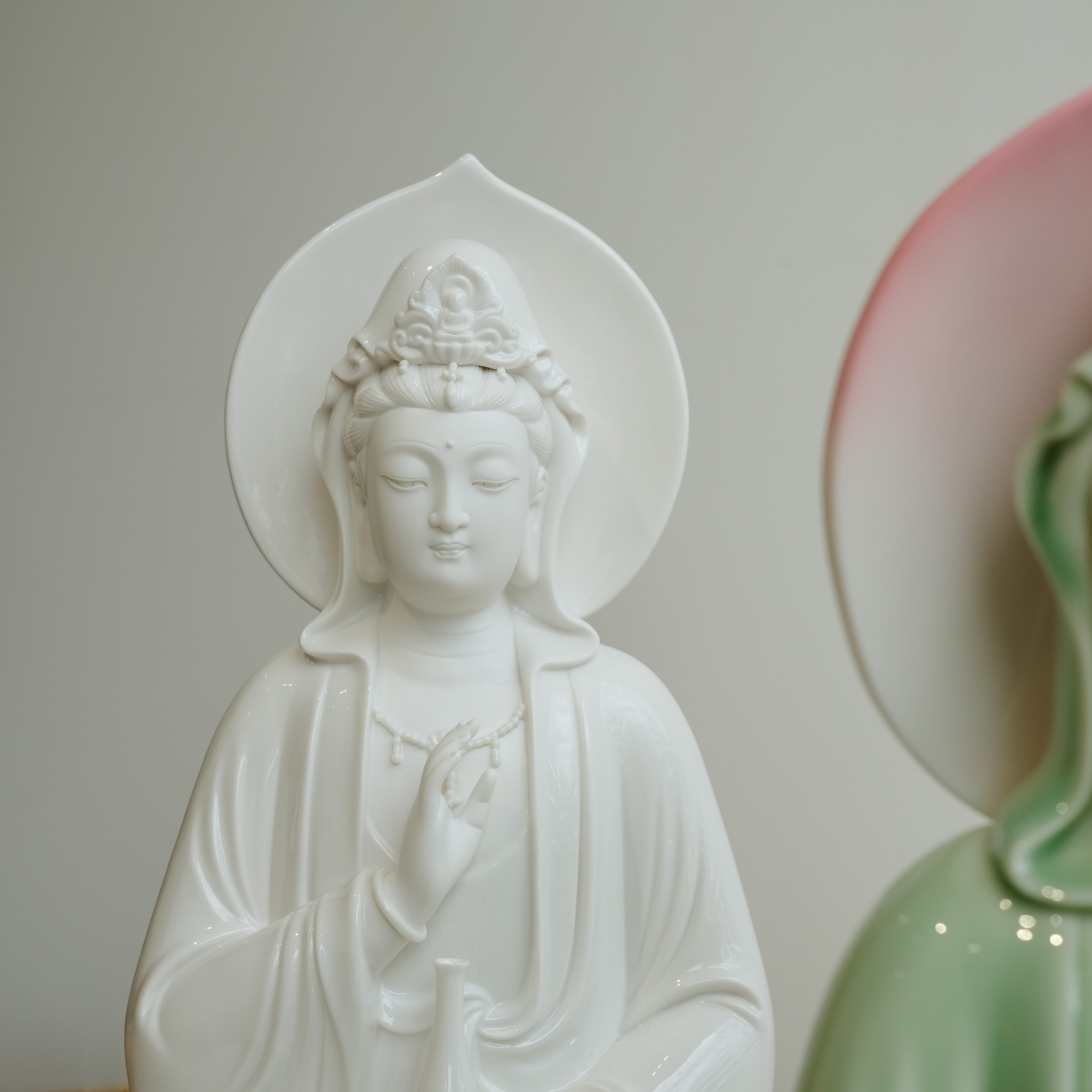 Tượng được làm bằng gốm, với hai màu trắng và xanh ngọc. mỗi chi tiết đều được nghệ nhân chăm chút tỉ mỉ, tinh tế, mang đến vẻ đẹp hiền hòa và trang nghiêm.