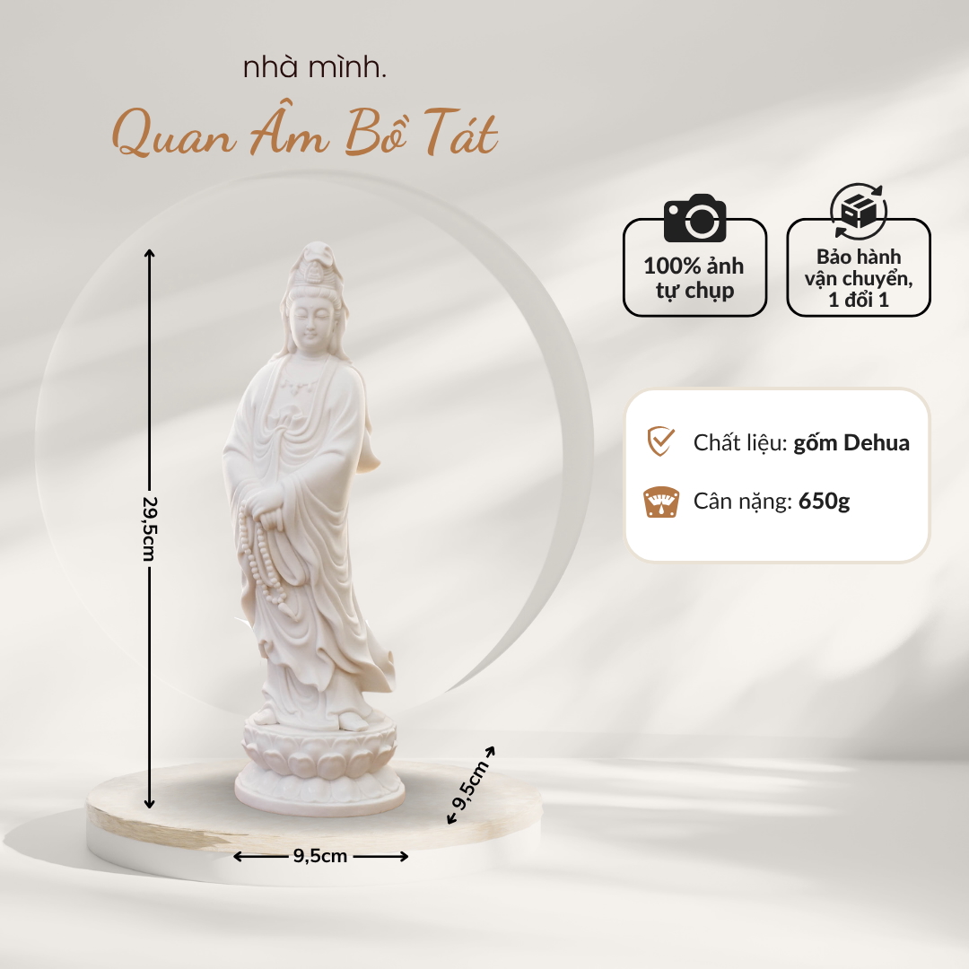 Tượng Quán Thế Âm Bồ Tát đứng đài sen được làm ở làng gốm Dehua lâu đời, diện Phật hiền hoà với những chi tiết y áo sắc xảo, tinh tế.